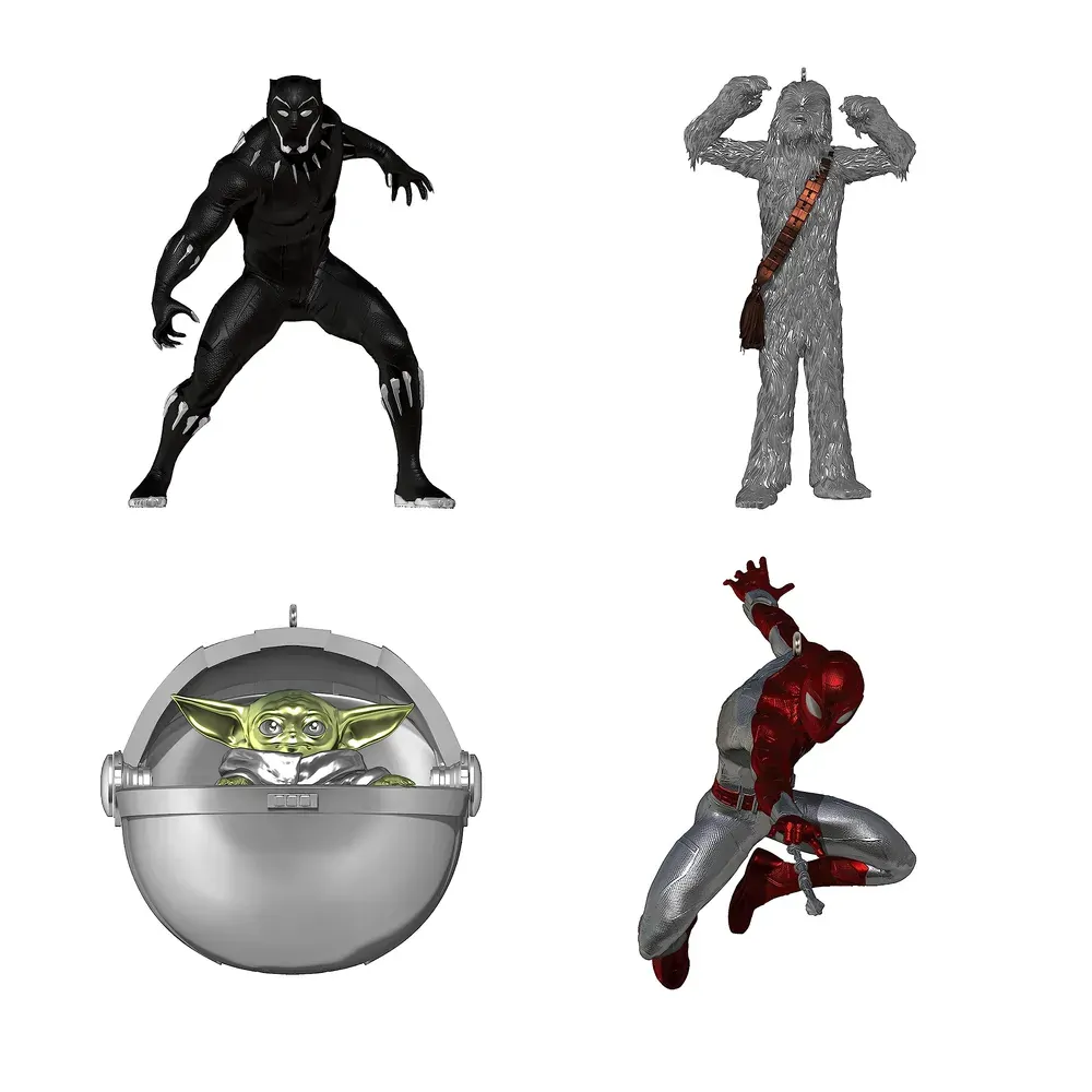 Celebrate 100 years of Disney wonder with this set of four Christmas tree ornaments. Includes beloved heroes from Star Wars (Chewbacca and Grogu) and Marvel (Black Panther and Spider-Man), each with a brushed nickel finish and colorful accents.