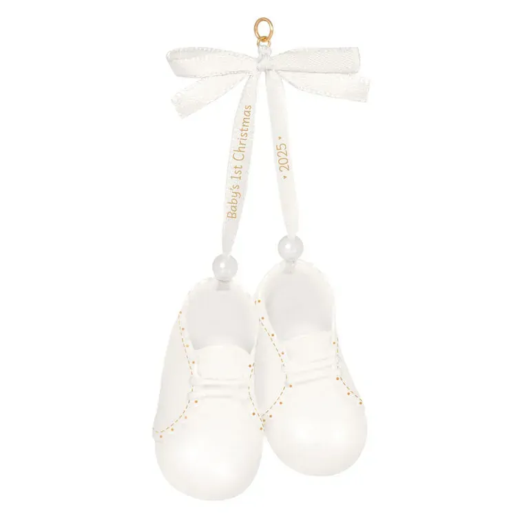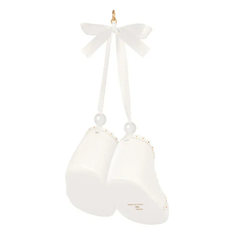 You'll always remember your baby's first Christmas. Commemorate this special time for your family with this sweet, year-dated Christmas tree ornament featuring a pair of porcelain baby booties with 14k gold accents hanging from a satin ribbon bow.