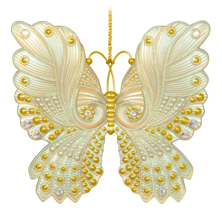 Send spirits soaring with this pretty butterfly Christmas tree ornament. The stunning butterfly features a beautiful gold and pearlescent design with gem accents. Scalloped edges and a subtle iridescent finish on the wings are sure to delight all who see it. 9th in the Brilliant Butterflies Keepsake Ornament series.