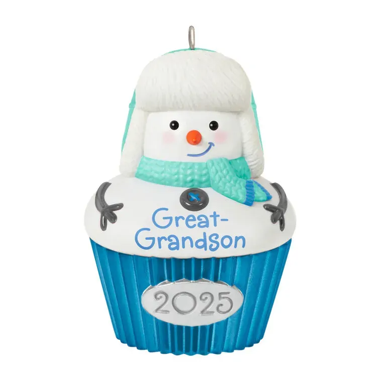 Sweeten the holidays for a special great-grandson with this whimsical Christmas tree ornament. The year-dated decoration features a smiling snow-boy, bundled up in a trapper hat and coordinating green and blue scarf, that looks like a tasty cupcake.