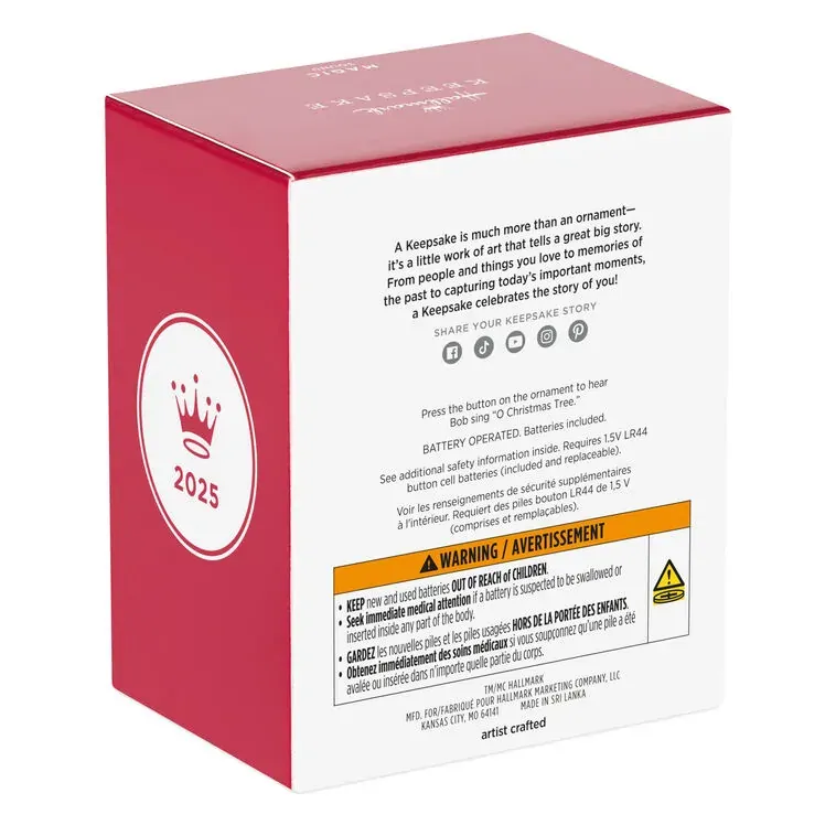 Holding a piece of shiny green tinsel garland, Bob the Minion is ready to trim your tree with holiday cheer. Press the button on this colourful Christmas tree ornament to hear the Minion sing a fun version of ''O Christmas Tree''.