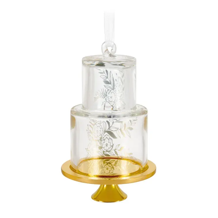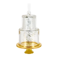 This elegant wedding cake Christmas tree ornament makes a perfect bridal shower or wedding gift for newlyweds to decorate their very first Christmas tree together. Featuring metallic gold leaf and flower designs on elegant, clear-glass cake tiers, the year-dated decoration is also perfect for year-round display to commemorate their big day.