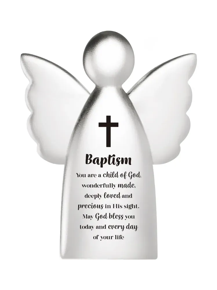 A silver-coloured angel ornament with a message perfect for a Baptism on it's front: 'Baptism: You are a child of God, wonderfully made, deeply loved and precious in His sight. My God bless you today and every day of your life.'