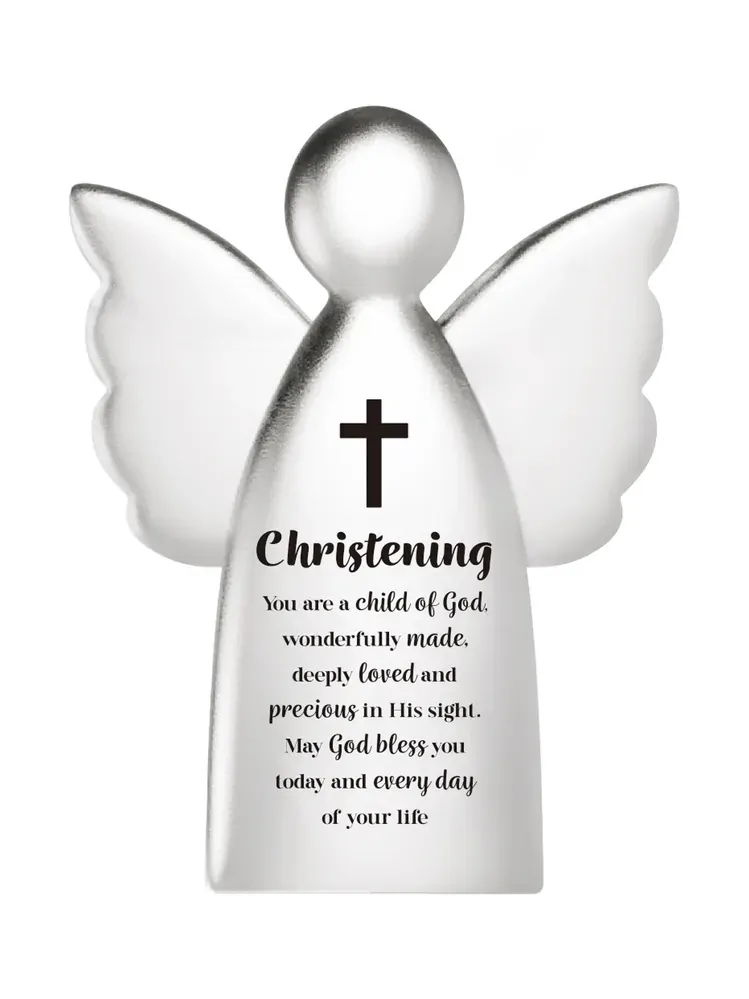 A silver-coloured angel ornament with a message perfect for a Christening on it's front: 'Christening: You are a child of God, wonderfully made, deeply loved and precious in His sight. My God bless you today and every day of your life.'
