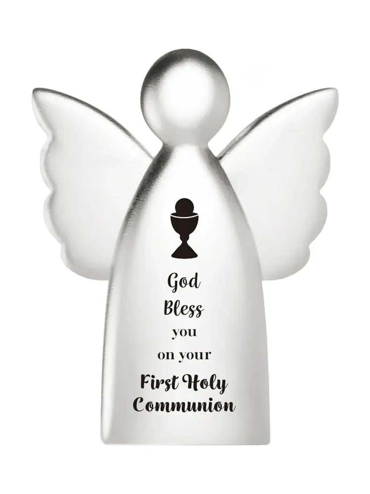 A silver-coloured angel ornament with a message perfect for a First Holy Communion on it's front: 'God bless you on your First Holy Communion.'