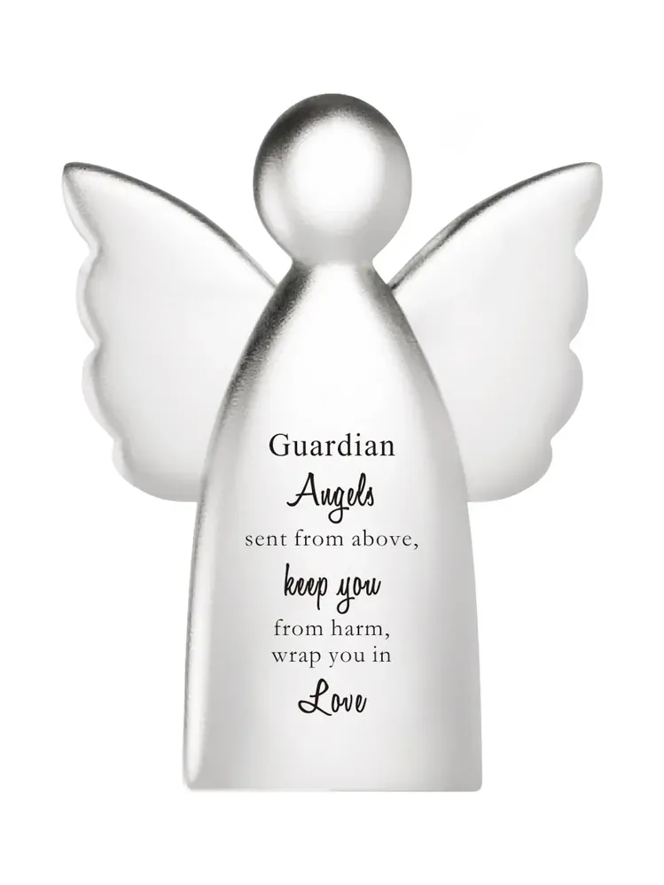 A silver-coloured angel ornament with an encouraging message on it's front: 'Guardian Angels sent from above, keep you from harm, wrap you in love.'