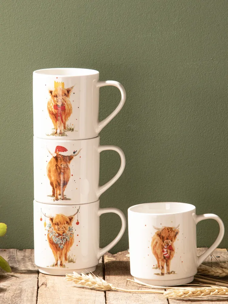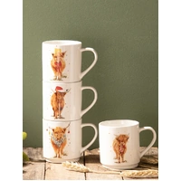 From Ashdene's Coo Christmas range, a set of 4 mugs that are able to be stacked neatly on top of each other for easy storage. They featuring adorable highland cows adorned in Christmas décor.