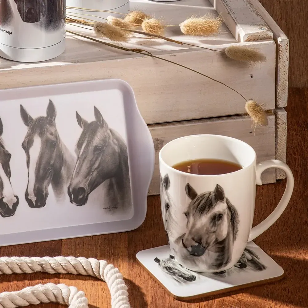 The Trio collection features stunning artwork from the talented Danguole Serstinskaja, who portrays the majesty of her equine subjects in a photorealistic style. These portraits feature a trio of chestnut, grey and black horses that stand proud against a white background.