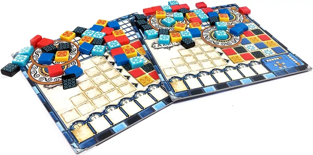 In the game Azul, players take turns drafting coloured tiles from suppliers to their player board. Later in the round, players score points based on how they've placed their tiles to decorate the palace. Extra points are scored for specific patterns and completing sets; wasted supplies harm the player's score. The player with the most points at the end of the game wins.