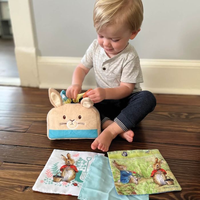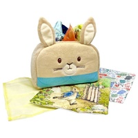 The Peter Rabbit Tissue Box Play Set features a soft Peter Rabbit tissue box that includes 8 tissues - 4 with double sided prints with Beatrix Potter artwork, 2 sheer and 2 satin tissues. This play set promotes fine motor skill development and features different colours and textures.
