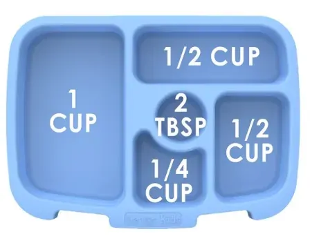 -Five compartments: left - 1 cup; back - 1/2 cup; right - 1/2 cup; front - 1/4 cup; sauce - 2 tbsp.