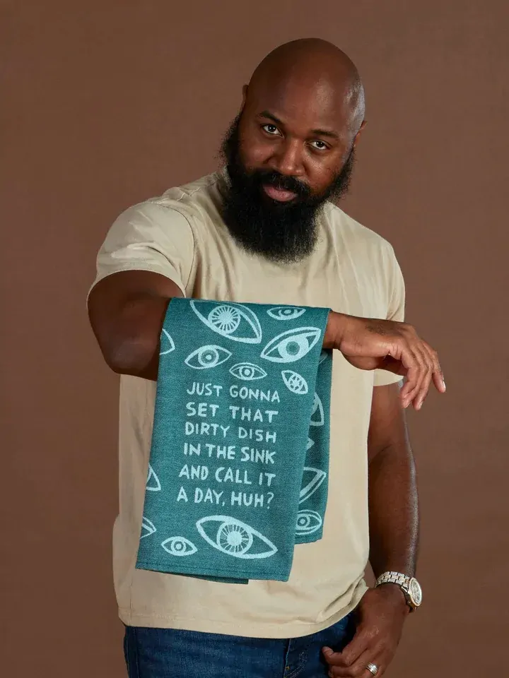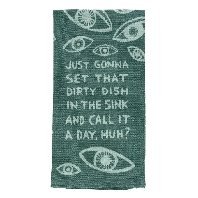 - Tea towel reads: "Just gonna set that dirty dish in the sink and call it a day, huh?"