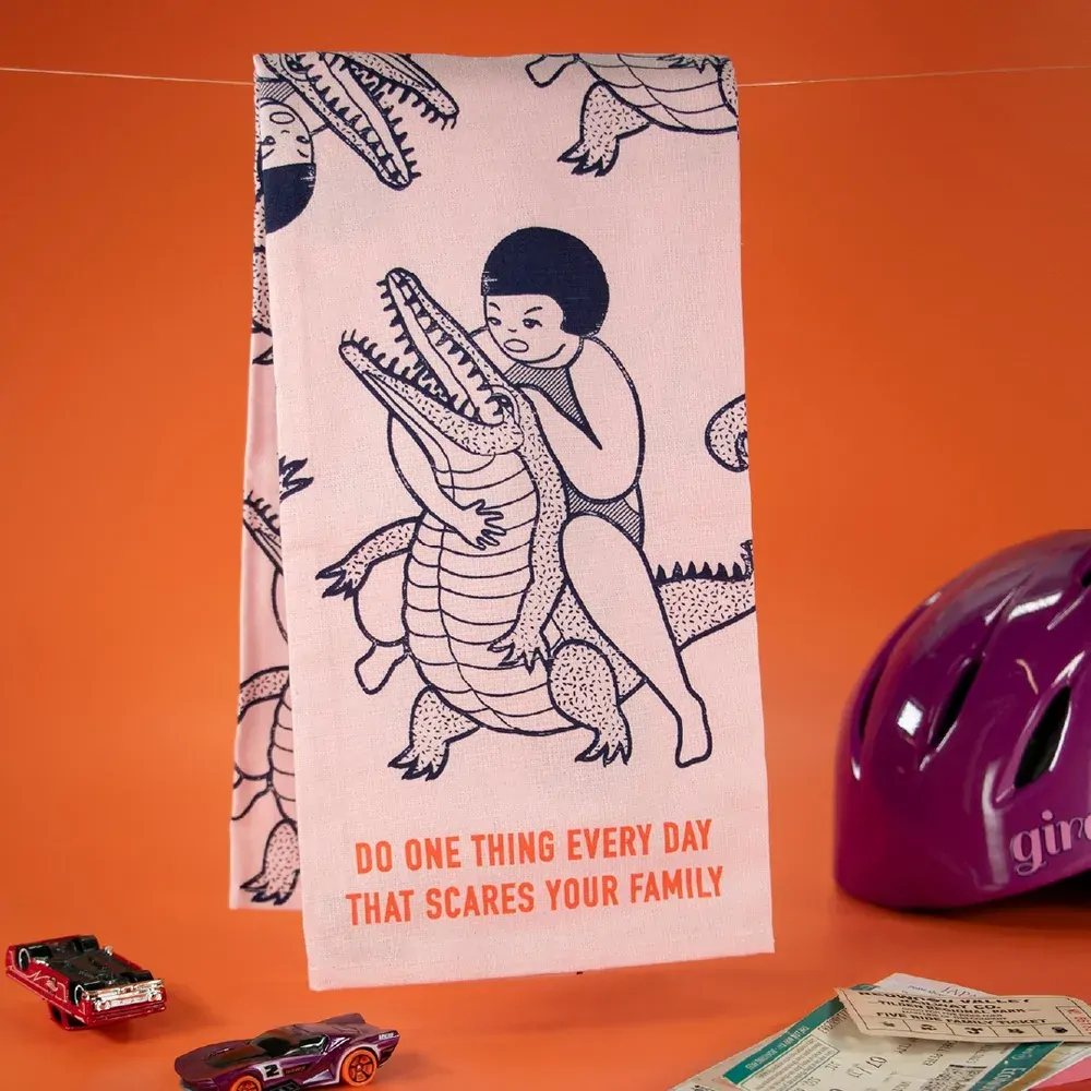 - Tea Towel Reads: "DO ONE THING EVERY DAY THAT SCARES YOUR FAMILY".