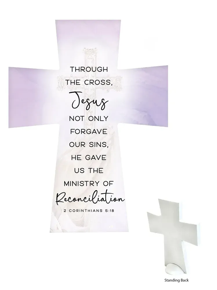 A beautiful ceramic standing cross featuring text that reads: 'Through the cross, Jesus not only forgave our sins, He gave us the ministry of reconciliation. - 2 Corinthians 5:18'.