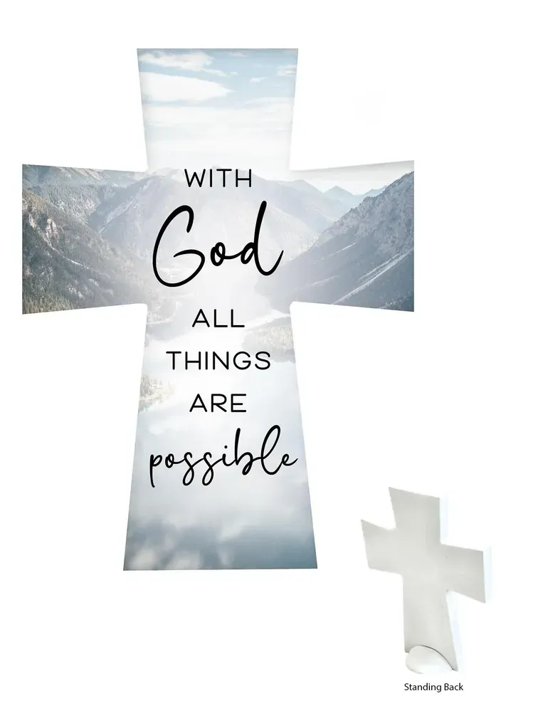 A beautiful ceramic standing cross featuring text that reads: 'With God all things are possible'.