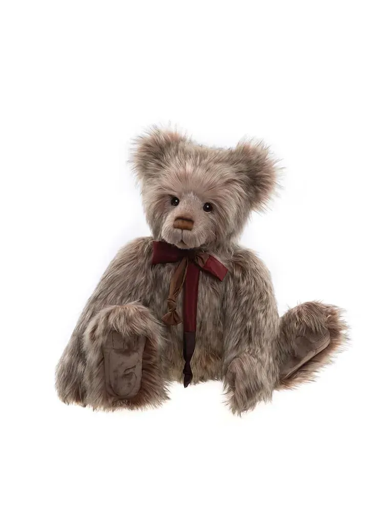 He is crafted from luxuriously soft, dense plush in beautifully blended shades of grey and brown, giving him a wonderfully textured, lifelike appearance. This standout bear features a hand-embroidered brown nose on a neatly shaved muzzle, expressive eyes full of personality, and sculpted paw pads. To complete his elegant look, Reynolds wears a smart red-brown neck-tie.
