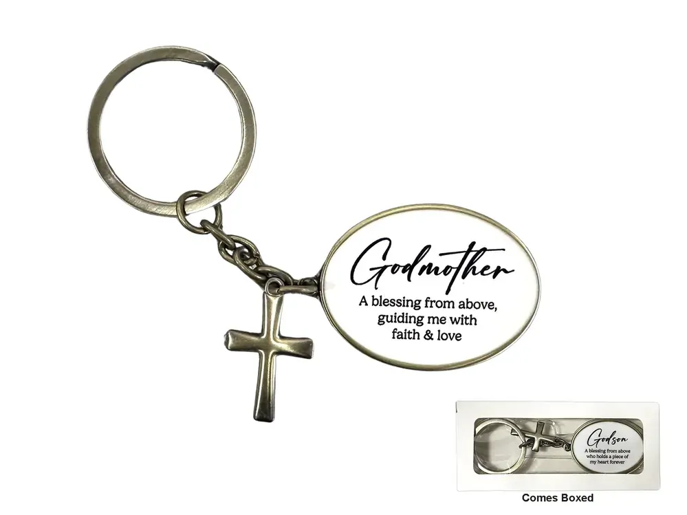 A sweet keepsake silver-coloured keyring in the shape of an oval with text that reads 'Godmother - A blessing from above, guiding me with faith and love'. The keyring also includes a small silver cross.