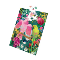 This friendly pink cockatoo has stopped to have a good ol' chin-wag to a fellow ringneck parrot and sweet little fairy wren. Imagine the tales they have to tell! Milly and Mae have used vibrant colours, patterns and joyful line work to capture these glorious native birds gathering among the beautiful Australian bush florals.