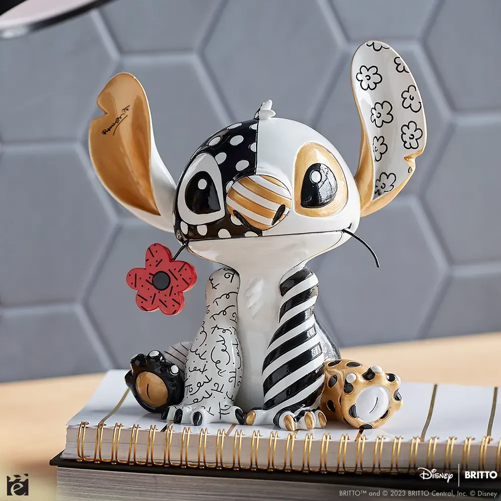 In a seated pose, this striking Stitch figurine has been given the midas touch in this stunning 18cm piece designed by Romero Britto. Stitch holds a red flower in his mouth and features a mixture of Britto’s signature patterns all over – including dots, stripes and flowers. With strong contrasting accents in black, white, red and shiny gold, this this iconic character is sure to delight Lilo and Stitch fans and collectors.