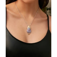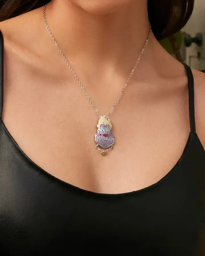 For fans of the most most villainous sea witch, Ursula, is this glistening necklace featuring her iconic hair, amethyst hued crystals and her iconic shell accessory.