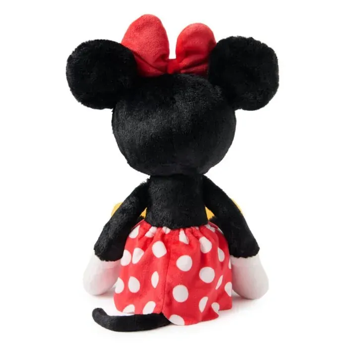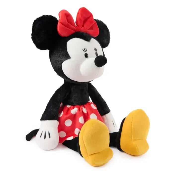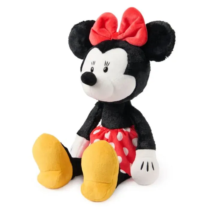 - Shows the iconic Disney character in her signature outfit with soft black and white plush, bright red skirt, white gloves, and yellow shoes