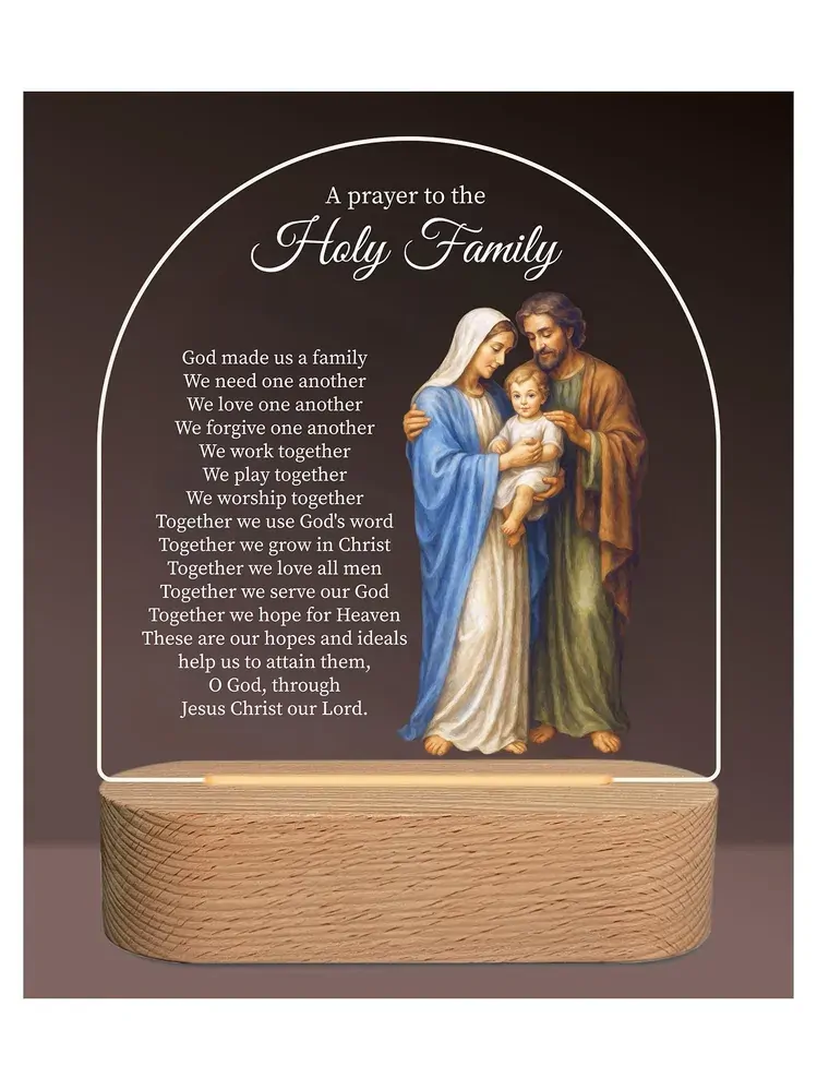A lovely LED light stand featuring a wooden base and an image of the Holy Family.