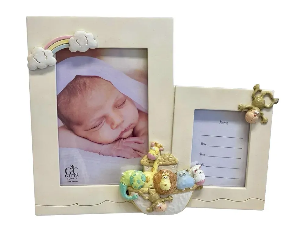A lovely double photo frame set to display picture of baby and their record. In a soft cream shade, it features 3D motifs of Noah's Ark and a rainbow. Fits a 150 x 100mm photo. The smaller frame has space for baby's name, birth date, time of birth, weight and more.