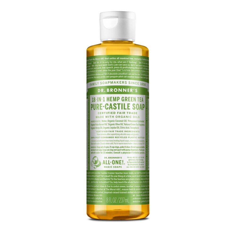 Dr. Bronner’s 18-in-1 Pure-Castile Soaps are good for just about any cleaning task. Face, body, hair & food, dishes, laundry, mopping, pets—clean your house and body with no synthetic preservatives, detergents or foaming agents—none!