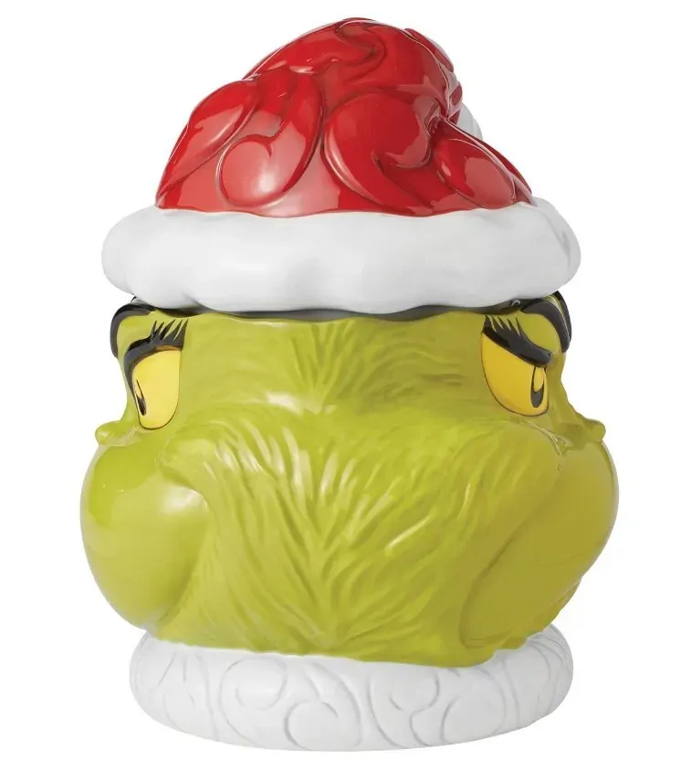 In The Grinch's latest effort to steal Christmas, he hides cookies from Santa in this festive head jar by Jim Shore. With a rosemale Santa hat lid, The Grinch smirks mischievously on one side of the jar and smiles sweetly on the other.