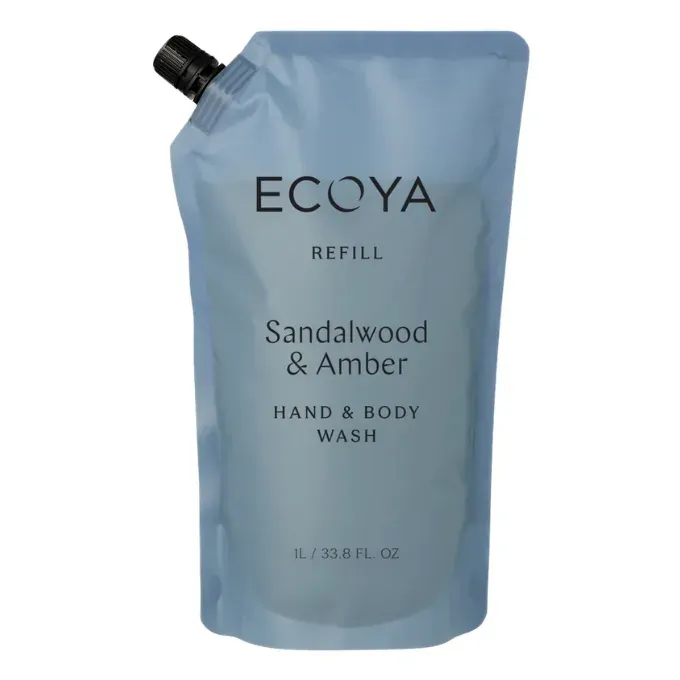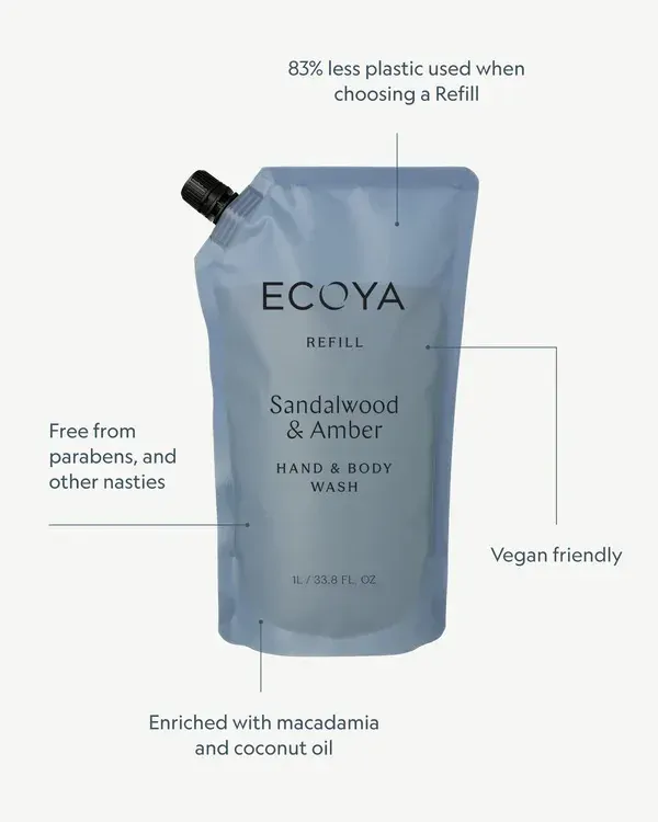 Replenish your hand & body wash with Ecoya's sustainable 1 litre refill pouch. A luxurious formulation, it uses the best botanical bases of macadamia and coconut oils and is free from parabens, propylene glycol, silicone and artificial colours.