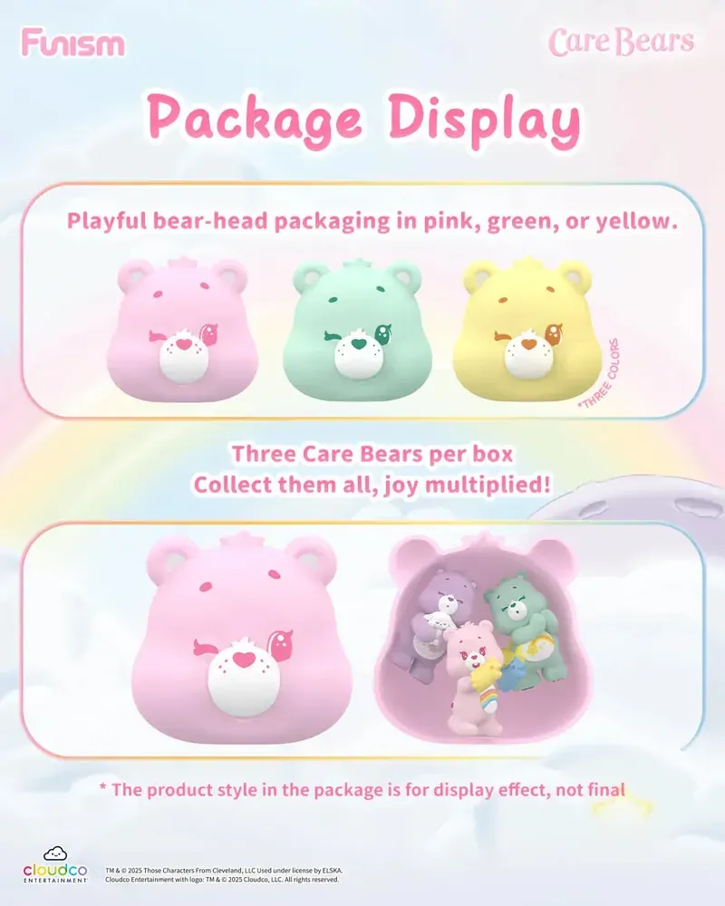 An officially licensed Care Bears product by Funism, these blind boxes each contain not just 1 but 3 Care Bear figurines, bursting with adorable quirks and unique charm and all dressed up in their signature pastels. The packaging itself also follows a pastel colour palette and is in the shape of a Care Bear head, available in Cheer Bear pink, Wish Bear mint green and Funshine Bear yellow.