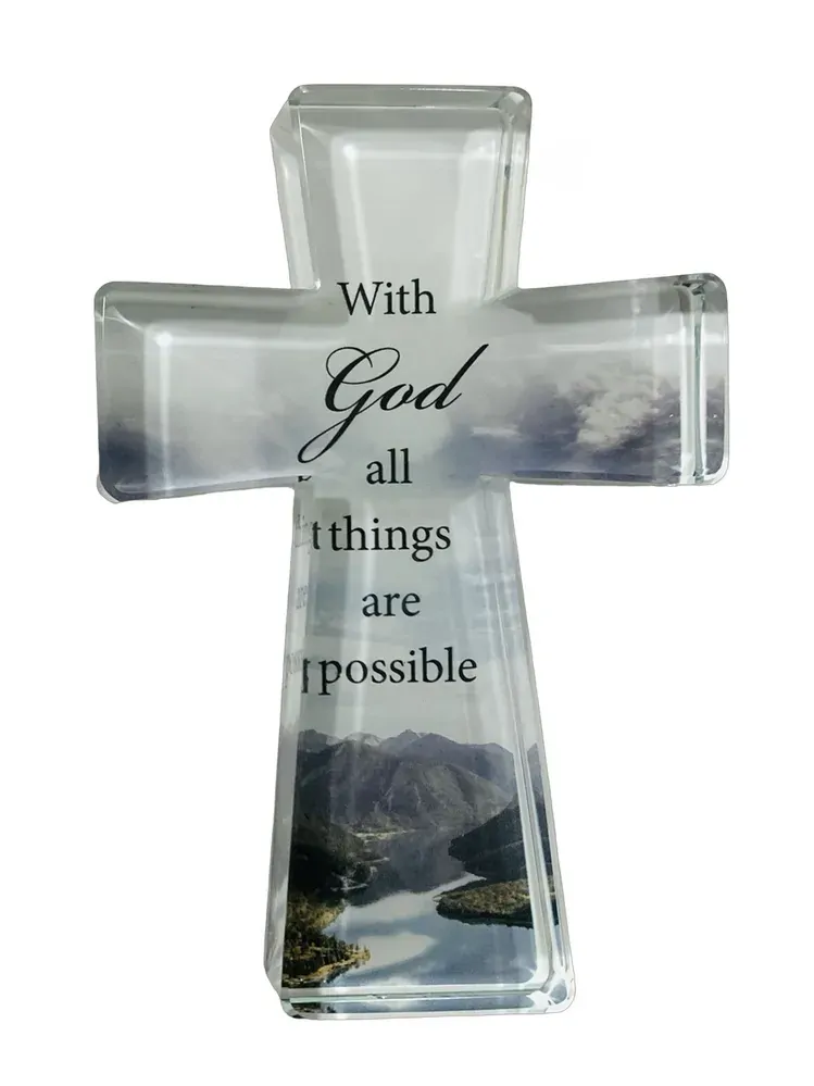 A beautiful glass cut standing cross featuring text that reads 'With God all things are possible'.