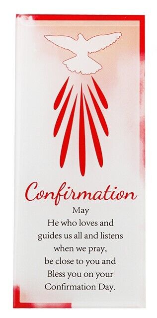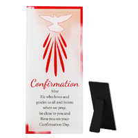 This glass plaque is in red and white, intricately detailed with an image of a dove. It would make the perfect gift for someone about to complete their Confirmation.