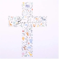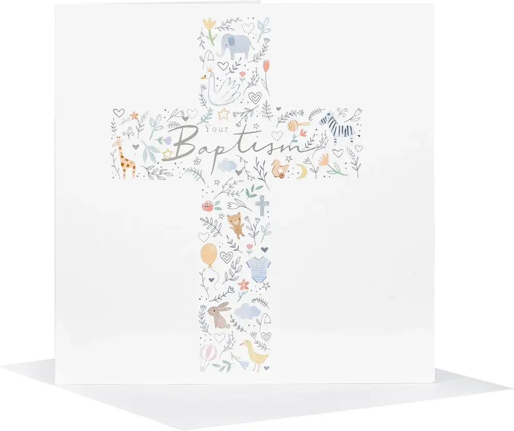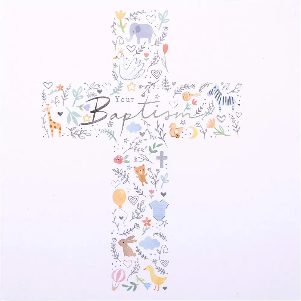 The front of the card features silver foiling, a cross shape filled with a motif of children's and animals and the message: Your Baptism". The inside of the card features some of the same motif around the message: A special day to celebrate you.