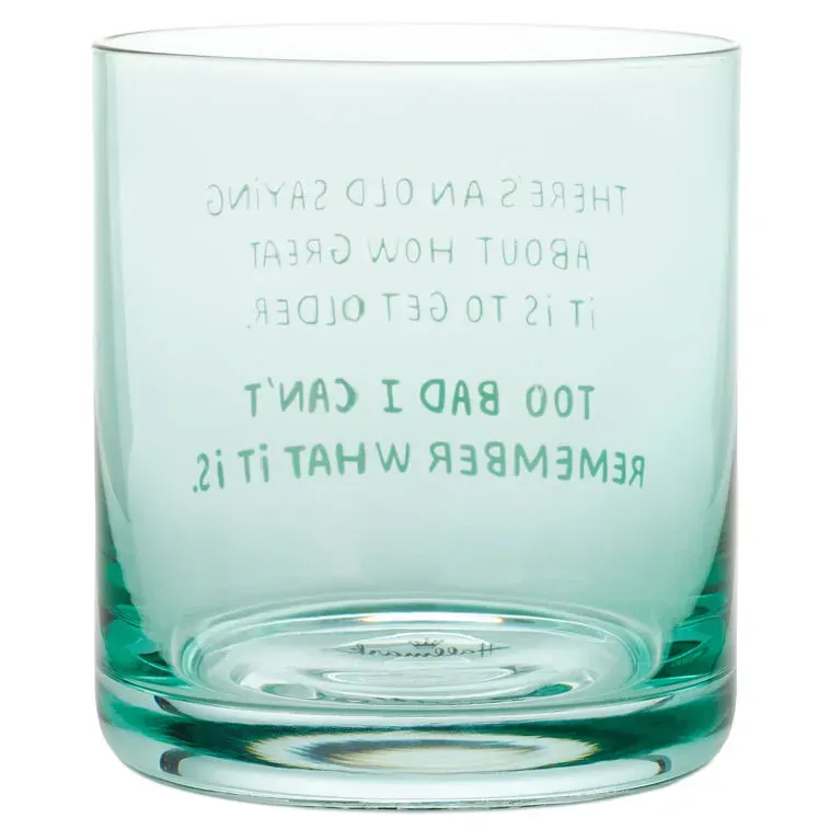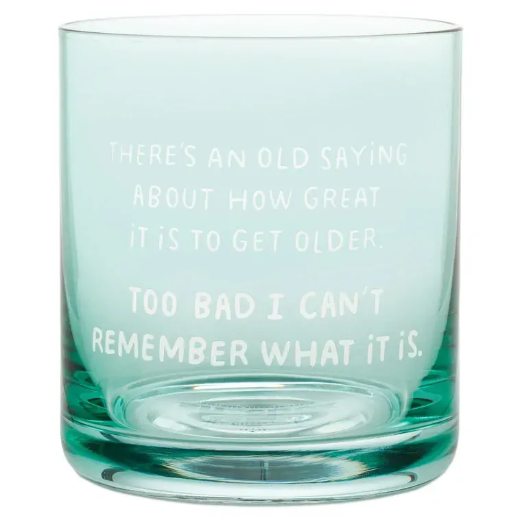 Make a drink that will impress upon your memories with this fun rocks glass in a green-tinted design. Printed with a funny message in white lettering, this lowball glass from Hallmark Shoebox adds a dash of bitter humour to the sweet cocktail you've created out of your long, full life. Pair it with other funny rocks glasses, stemless wine glasses and coasters for barware that's outfitted to handle all the requirements of your friends and family with a shot of humour.