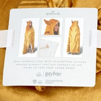 Catch a moment to yourself and snuggle up for an evening of watching your favorite Quidditch scenes from Harry Potter movies with this Golden Snitch hooded blanket. Cozy, oversized wearable throw blanket in soft gold-toned fleece features a hood with wings and a large button on the collar. Inside pockets on the top two corners of the blanket are perfect for keeping hands warm and ready to grab a flying orb from the air or the remote from your roomie. Golden Snitch blanket features scrollwork patterns on the back and striped wings on the hood, making it a great gift or a cuddly winter accessory for your own comfy couch.