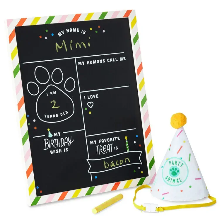 - Pet birthday bundle includes a prompted chalkboard and a fabric party hat to celebrate their day