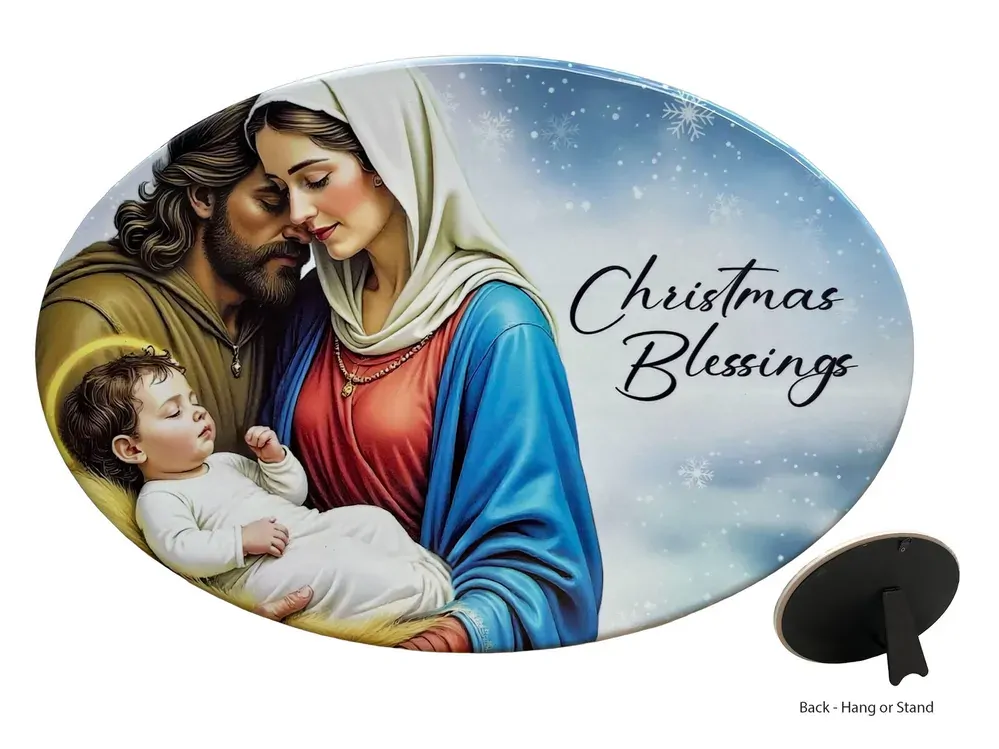 A beautiful oval-shaped plaque featuring an image of the Nativity - Mary and Joseph holding baby Jesus, accompanied by script reading 'Christmas Blessings'. The back of the plaque has both a loop and stand for easy hanging or freestanding.