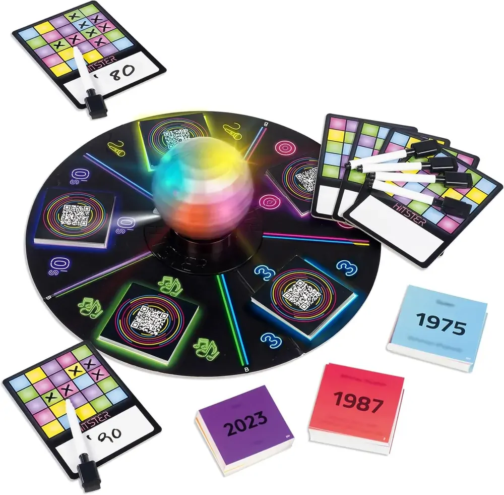Get ready to spin the disco ball and groove to the beats in Hitster Bingo! Spin the disco ball to reveal the category, scan the card, and let the music play. Guess the decade, identify singers or bands, choose the exact year, or determine if it's before or after the 2000s. Be the first to complete a row or column with the four different categories to be crowned the Hitster Bingo champion!