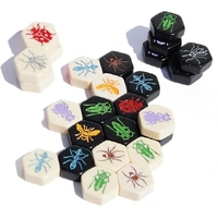 Each of the tactile resin (Bakelite) tiles has a unique way of moving, similar to chess, and resembles the movement of the insect depicted on the tile. Choose the best tactics to place the right piece wisely and be the first to block the Queen Bee in the Hive.