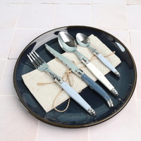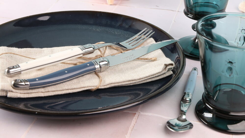 Enjoy every meal in style with this authentic 24 piece cutlery set from Jean Dubost Laguiole. This set is produced with the Maison finish, the blades stamped, ground and polished over 25 manual production stages to create a high shine effect. Made from high grade 1.2mm stainless steel. Handles are made from high impact, lightweight Acrylonitrile Butadiene Styrene (ABS) plastic ensuring durability and high mechanical strength.