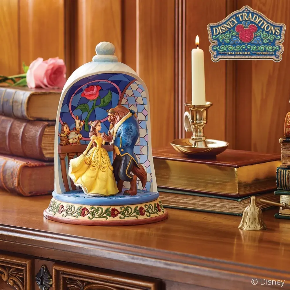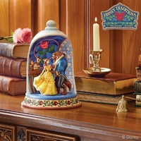 This Jim Shore hand-painted diorama figurine helps celebrate the 30th anniversary of the legendary romance of Belle and the Beast. Very enthusiastic Lumiere, Cogsworth and Mrs. Potts watch as Belle and the Beast share a moonlight waltz and loving gaze.