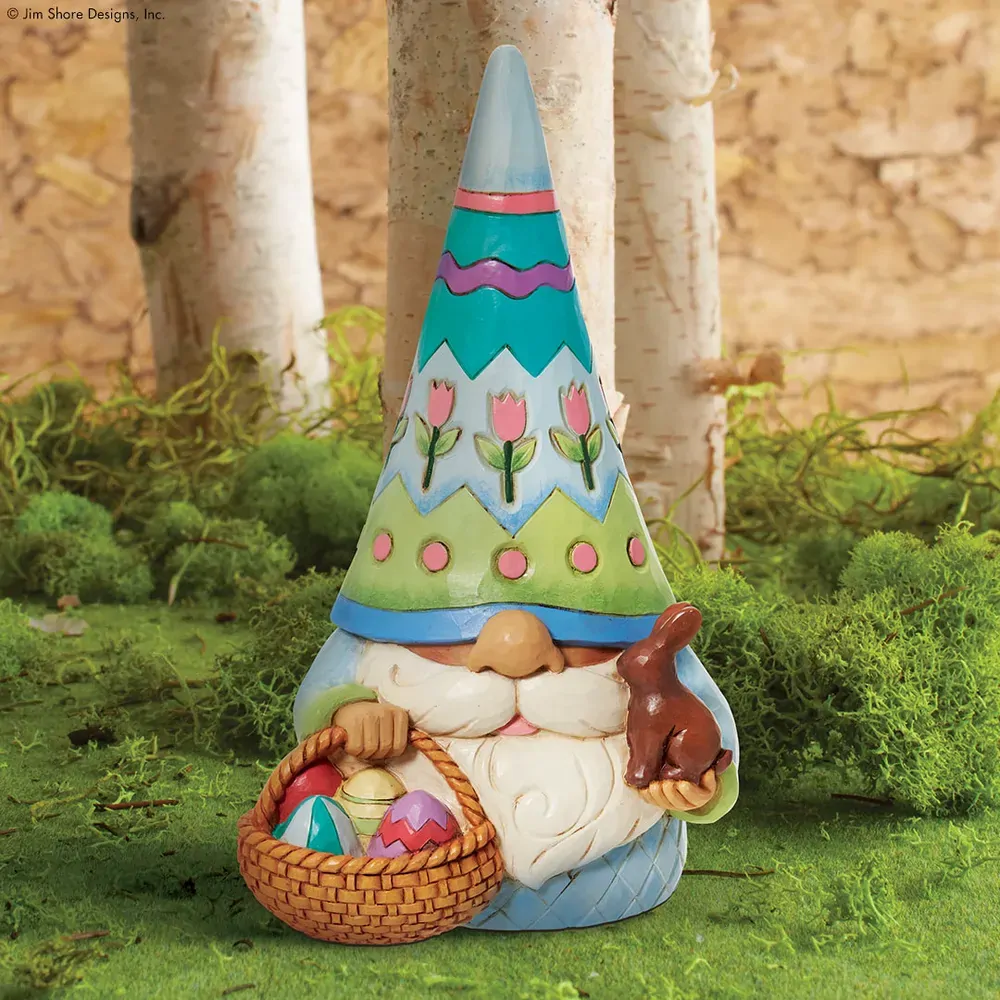 No one knows gnomes quite like Jim Shore! This Springtime gnome wears a pastel colored hat of flowers to reign in the season. Holding an Easter basket of painted eggs and a chocolate bunny gnomebunny loves Easter more!