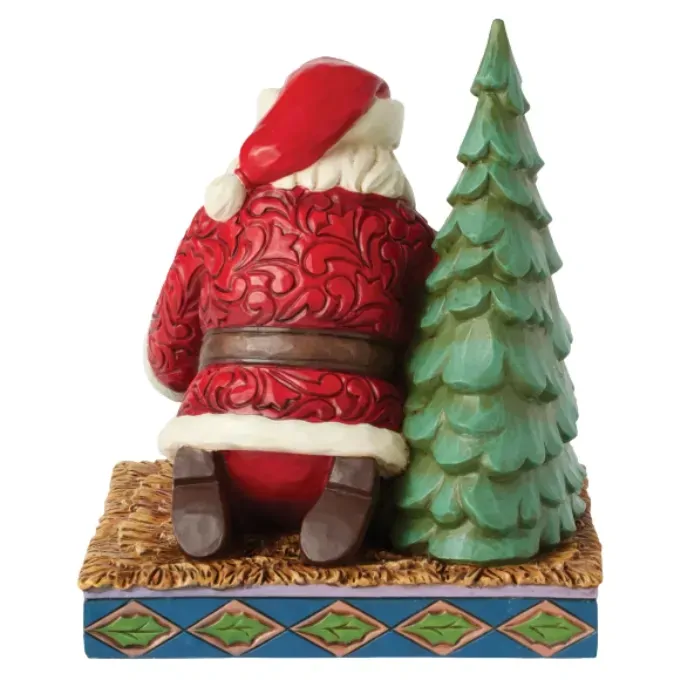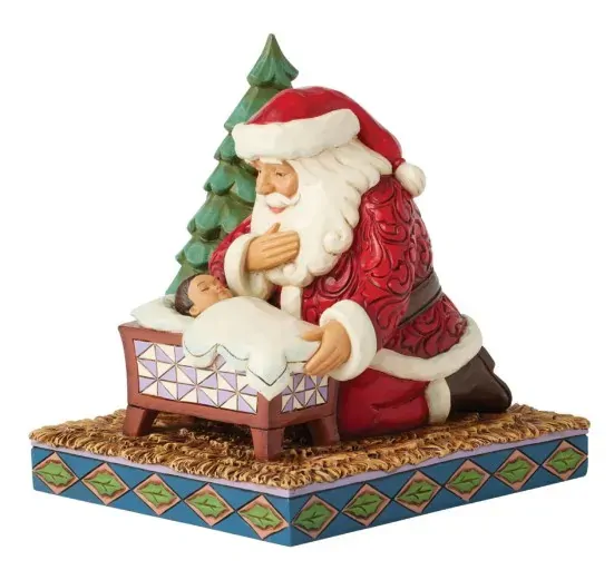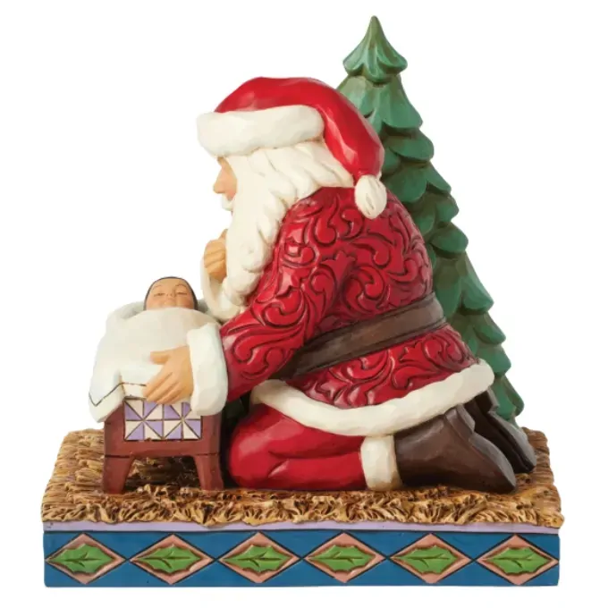 In this touching Jim Shore design, Santa kneels beside a cradle, hand over his heart, as he gazes with overwhelming joy at the sleeping baby Jesus. His serene expression reflects the deep reverence for the true meaning of the season.