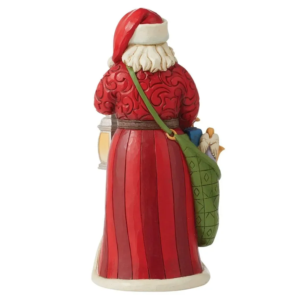 Wading through a winter night, lantern in hand, Santa makes delivers on foot with a large bag of enticing toys. With an image of Santa's sleigh flying over a town, a large Christmas tree is framed on Santa's cloak with a emerald Swarovski crystal.