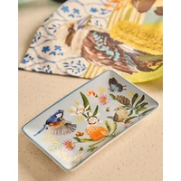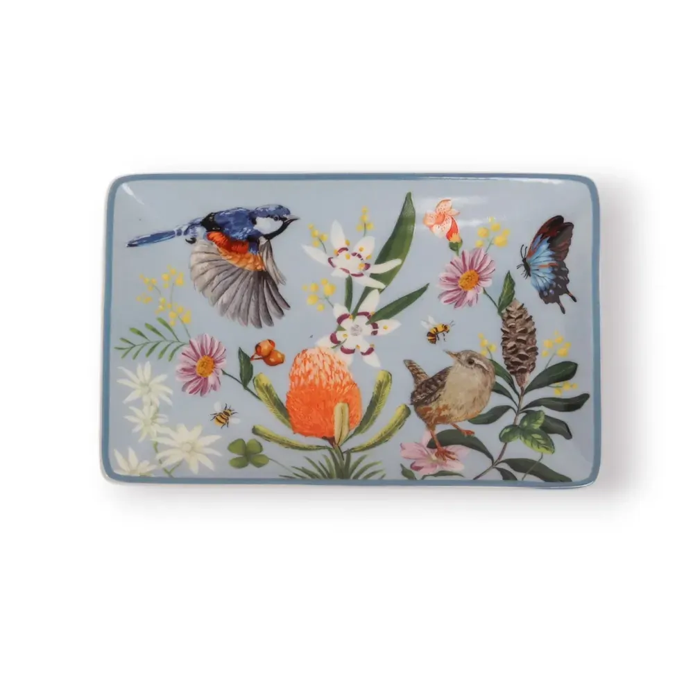 Bring a sense of calm, nature-inspired beauty into your home with the Rectangle Trinket Tray Backcountry. Crafted from glazed ceramic, this elegant tray features detailed illustrations of native birds, wildflowers and foliage set against soft, earthy tones, evoking the quiet charm of the Australian backcountry. Perfectly sized for holding jewellery, keys or small everyday essentials, this rectangular trinket tray is both decorative and practical. The smooth glazed finish makes it easy to clean, while the gently raised edges help keep items neatly in place. Subtle detailing around the rim adds a refined touch, allowing the artwork to truly shine.