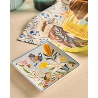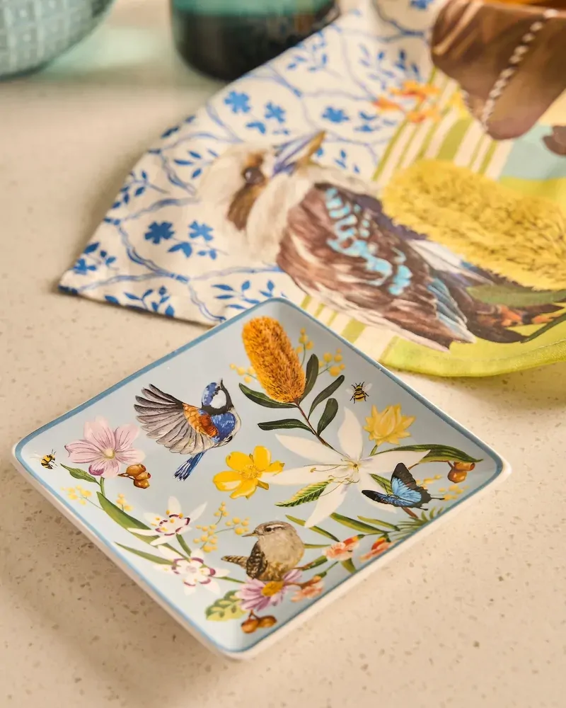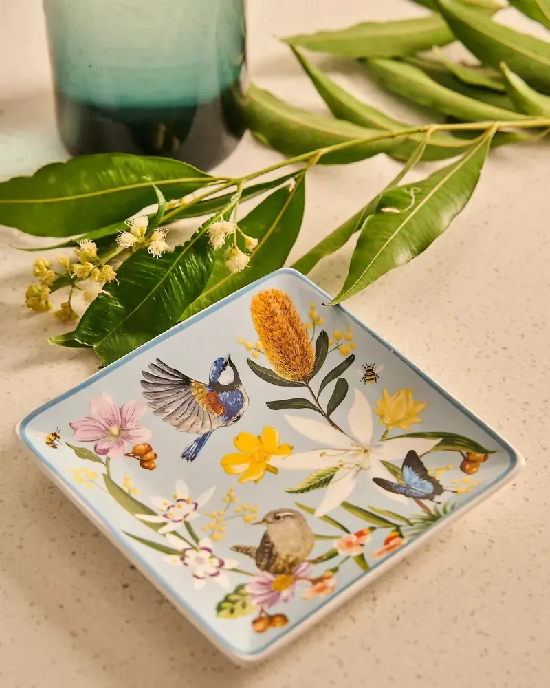 Bring a touch of nature-inspired charm into your home with the Square Trinket Tray Backcountry. Crafted from glazed ceramic, this beautifully illustrated tray showcases native birds, delicate wildflowers and foliage in soft, calming tones inspired by the Australian backcountry. Perfectly sized for holding jewellery, keys or small everyday essentials, the square shape offers a compact yet eye-catching way to keep your space organised. The smooth glazed finish ensures easy cleaning, while gently raised edges help keep items secure and neatly contained. Designed to sit effortlessly on a bedside table, bathroom vanity or desk, this trinket tray balances practicality with decorative appeal. Fine detailing and a subtle coloured rim frame the artwork, allowing the intricate illustrations to take centre stage.