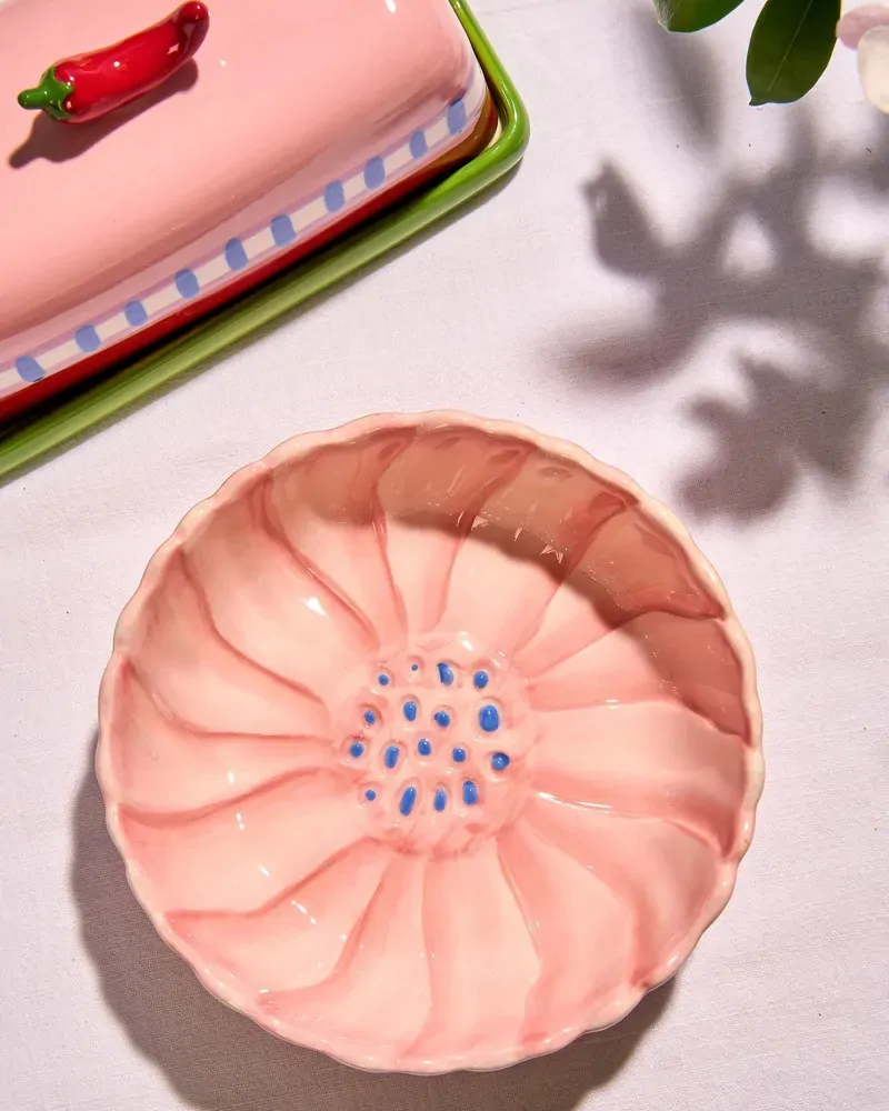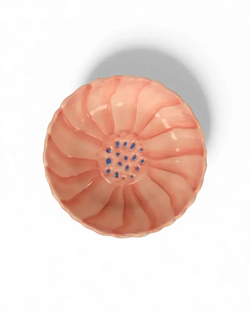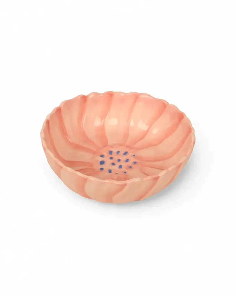 Delicate in form yet designed for everyday use, the Blush Stoneware Flower Bowl brings soft colour and sculptural beauty to your table. Shaped like a blooming flower, this stoneware bowl features gently fluted edges and hand-painted detailing in warm blush tones, finished with subtle blue accents at the centre for an unexpected pop of contrast. Crafted from durable stoneware with a glossy glaze, the bowls organic shape adds visual interest while remaining practical and versatile. Perfect for serving snacks, dips, desserts or small side dishes, it also works beautifully as a decorative piece on a coffee table or open shelf. The floral-inspired silhouette brings a sense of charm and artistry to both casual and styled settings.