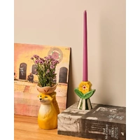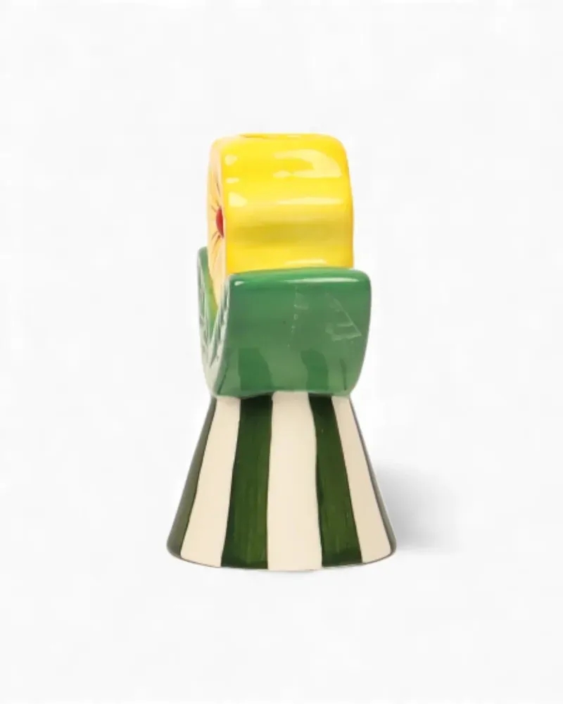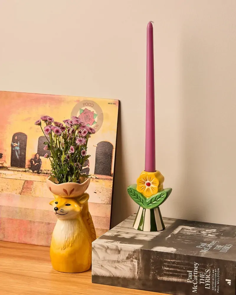 Bring a playful, nostalgic touch to your home with the Retro Folk Stoneware Candle Holder. Designed to make a statement, this sculptural piece blends folk-inspired motifs with bold colour and texture, creating a decorative accent that feels both whimsical and timeless. Crafted from glazed stoneware, the candle holder features a fluted base with hand-painted stripes, topped with a raised floral detail and leafy accents in rich green and warm yellow tones. Designed to hold a tapered candle, its sturdy base provides stability while the detailed finish adds character whether lit or styled as a standalone object. Perfect for styling on a mantel, dining table or bookshelf, this stoneware candle holder brings warmth and charm to both everyday interiors and special occasions. Ideal as a thoughtful gift or a statement piece for your own home, the Retro Folk Stoneware Candle Holder pairs beautifully with other pieces from the Retro Folk range.