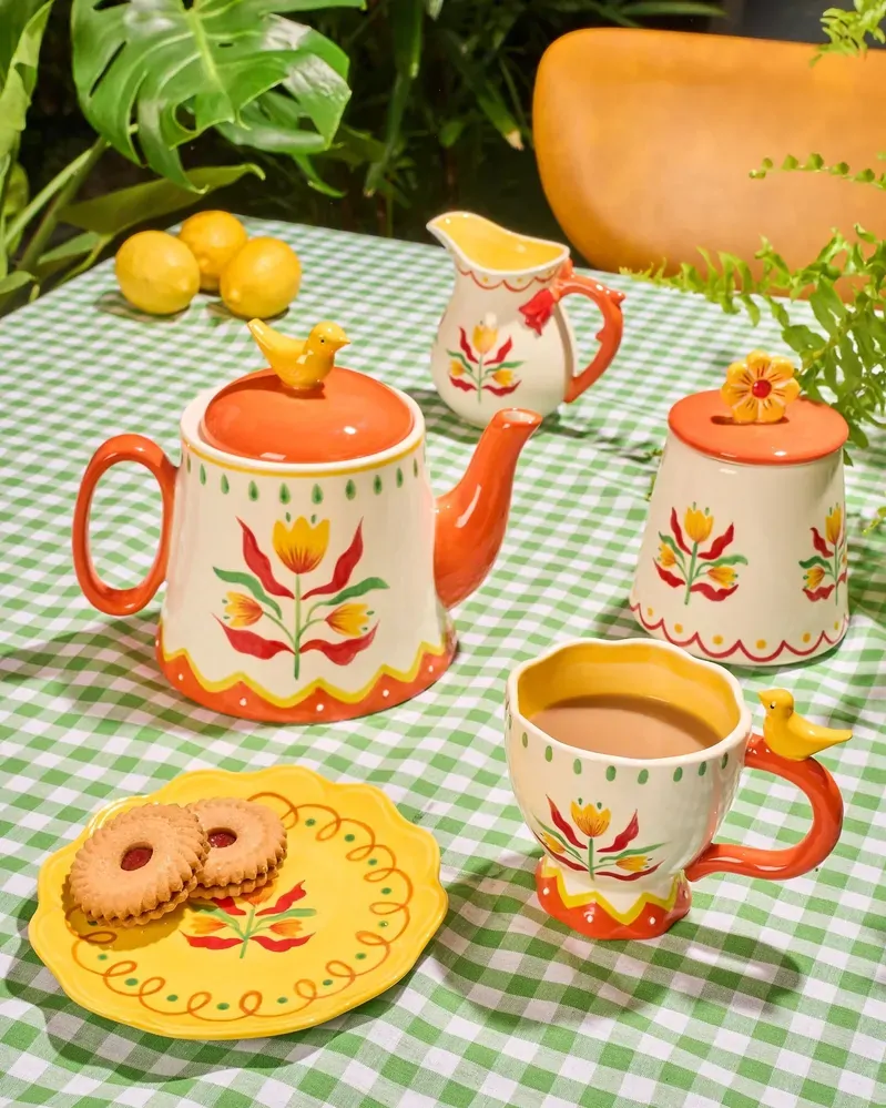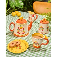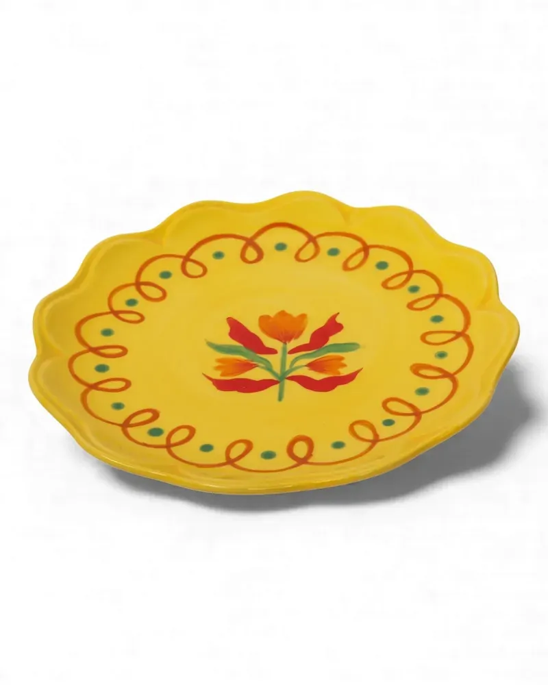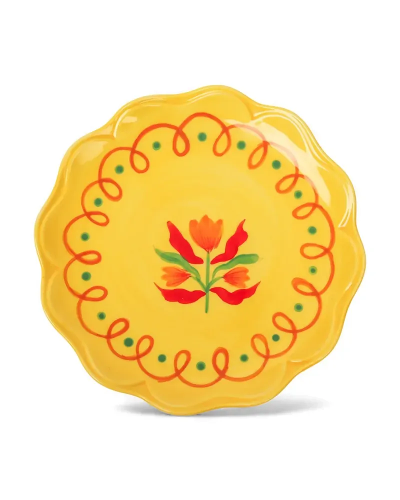 Add a touch of nostalgic charm to your table with the Retro Folk Stoneware Hand Painted Plate. Inspired by traditional folk art, this vibrant plate features a warm yellow base adorned with delicate hand-painted style florals, looping red details and soft green accents that create a cheerful, vintage-inspired design. Crafted from durable stoneware, this plate combines everyday practicality with decorative appeal. The gently scalloped edge adds a classic touch, while the colourful motif at the centre brings personality and warmth to any table setting.